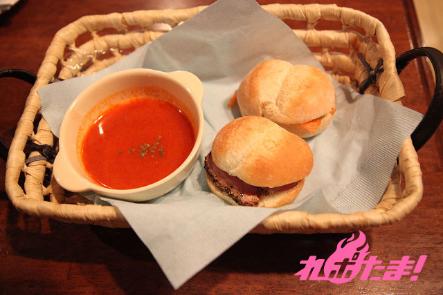 ココアとチノの苦手なトマトジュース、セロリを食べやすくアレンジしたバスケット。トマトの冷製スープにサンドを浸して食べてもOK! 大人なアナタには酒の肴としてもおススメです!