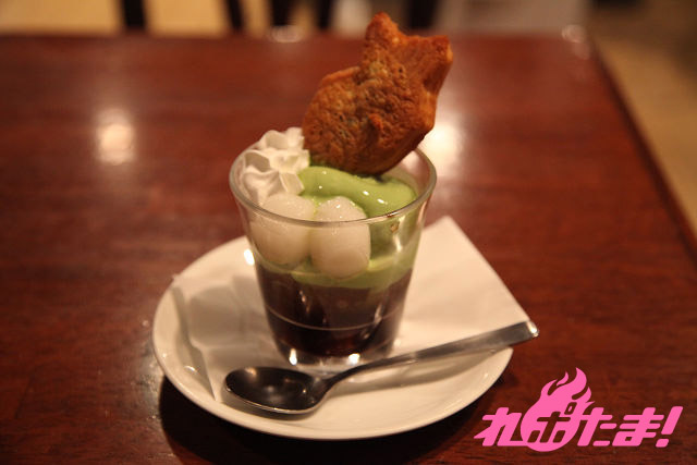 千夜が働く「甘兎庵」のメニューで、ココアが頼んだスペシャルパフェを再現。あんこギッシリのミニたい焼きにゴロッとした白玉がいいアクセントに。
