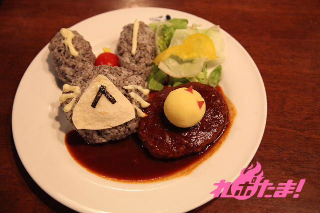 『ラビットハウス』のマスコット的存在・ティッピーのシルエットをかたどったポテトと『甘兎庵』の看板うさぎ“あんこ”のシルエットをかたどったごはんが載ったハンバーグプレート。もちっとした食感のごはんとボリューミーなハンバーグで大満足!