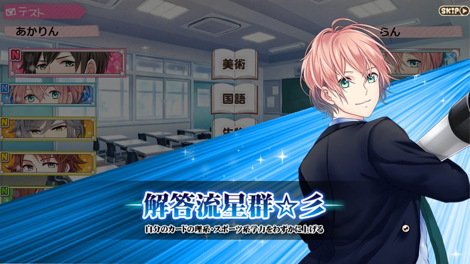キャラクターごとの得意科目・苦手科目の把握や、カットインイラスト付きのスキル、カレたち同士の協力技などを駆使して、バトルの勝利を目指しましょう。