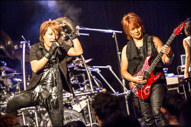 スケールあふれるシンフォニックな演奏が場内に広がり出した、「タイタニア」のエンディングテーマ『LOST IN SPACE』。雄大な曲調ながらも、口づさみたくなるキャッチーさを備えた「轟轟戦隊ボウケンジャー」のエンディングテーマ『冒険者 ON THE ROAD』のような、ちょっと懐かしさを覚える楽曲が流れれば。近年のサイキックラバーの顔となっている「カードファイト!! ヴァンガード リンクジョーカー編」のオープニングテーマ『Vanguard Fight』や、「超爆裂異次元メンコバトル ギガントシューター つかさ」のオープニングテーマ『ギガントシューターだっちゅーの!』のように、疾走感と解放性を魅力としたアメリカンハードロック・テイストをたっぷり満載した楽曲も、数多く演奏。場内へ、熱狂の拳突き上げゆく風景を終始描き続けていた。