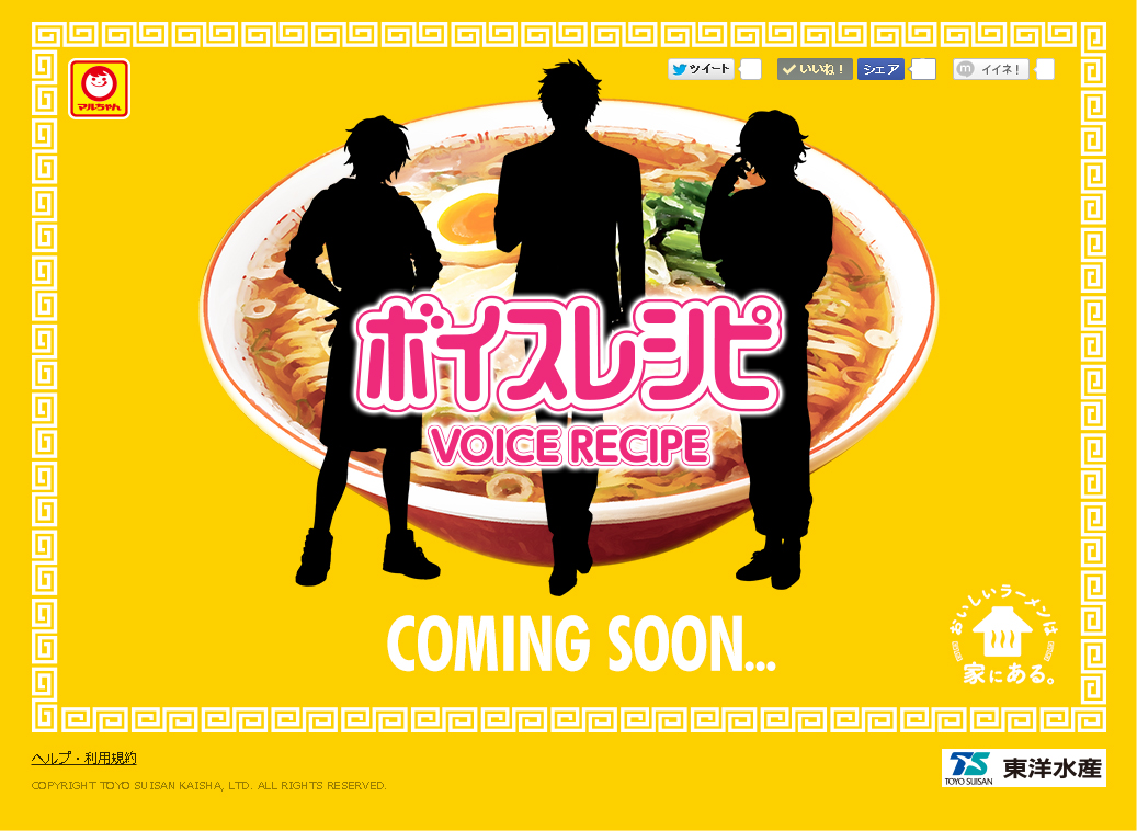 本サイトでは、キャンペーンの重要な要素となる3キャラクターのシルエットと共に、コンテンツタイトル『ボイスレシピ(VOICE RECIPE)』のロゴを掲載しております。ボイスレシピはその名の通り、ボイスでナビゲートする斬新なレシピ。人気男性声優3人がラーメンをつくるあなたを甘く、優しく、声でサポートします。主人公となるキャラクターイラストや声優名など、キャンペーンの全容は次回のサイト更新の2014年10月28日(火)に発表致します。