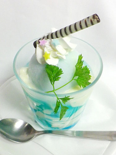 ノエル色のヨーグルトゼリーとアイスクリームにトッピングしたのは天文台をイメージした、ホイップとチョコレートとスターシュガーです。