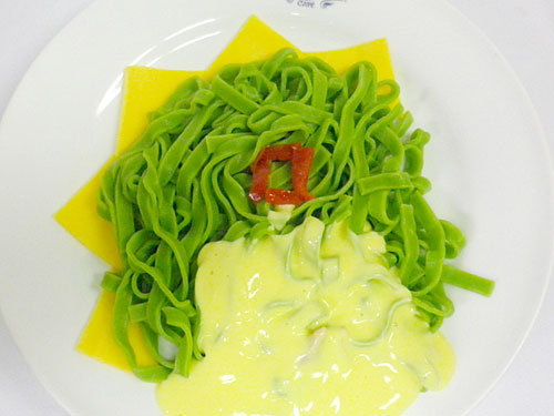 ほうれん草入りのタリアテッレに、ベーコンを加えたカルボナーラ、背中はチーズで美味しく仕上げました。