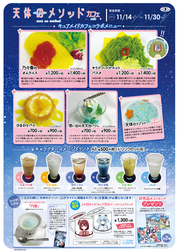 乃々香やノエル達をイメージしたドリンクやフードなどをご用意し、さらに店内も「天体のメソッド」の展示でいっぱいになります。コラボメニュー注文で非売品ポストカードもプレゼント!