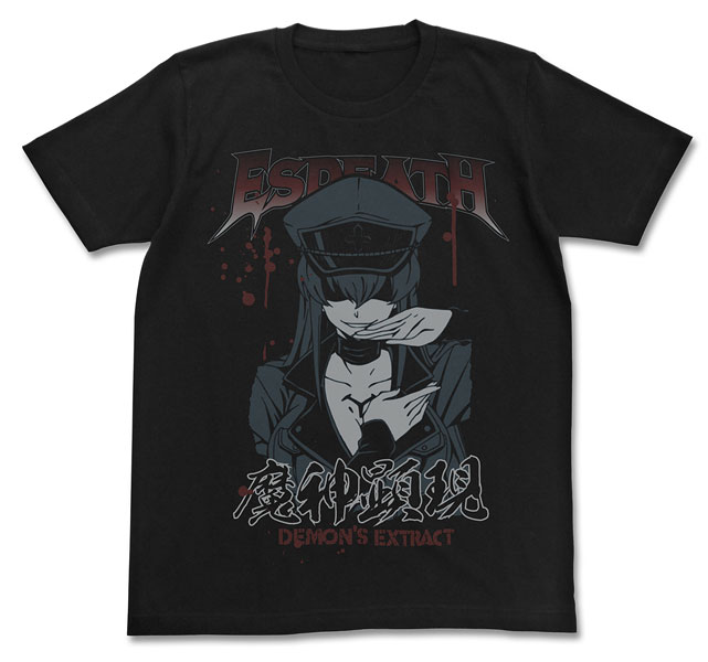最後は女将軍“エスデス”のTシャツ。ロックテイストのハードなデザインに、瞳を見せず不適に笑うエスデス様に痺れる!!ドSなエスデス様について行ける貴方にこそ相応しい逸品だ。