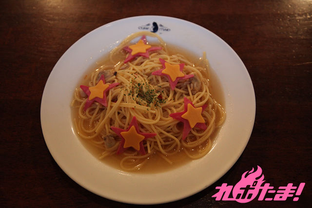 アサリと鷹の爪が入った、ピリッと辛めのスパゲッティ。イオナがボンゴレビアンコの海に浮かべたヒトデを模した、チーズとハムを星形に切った素材が味を引き立てる。