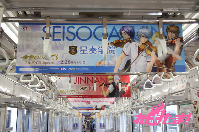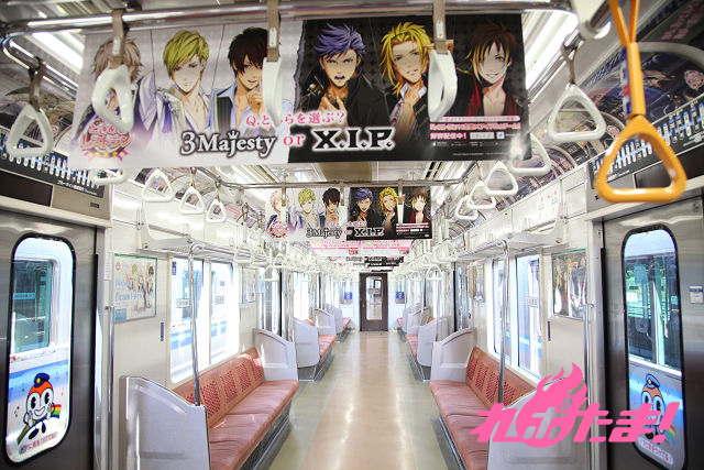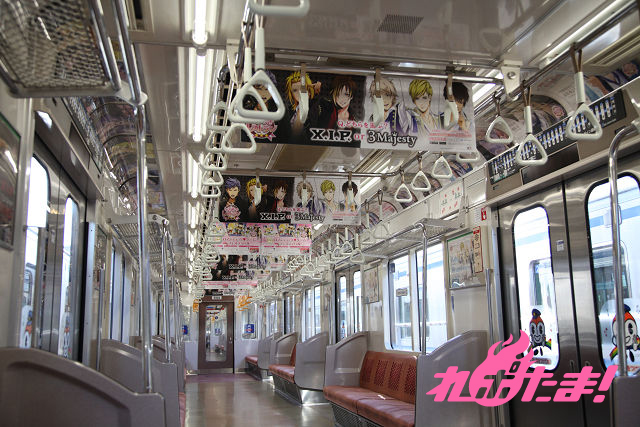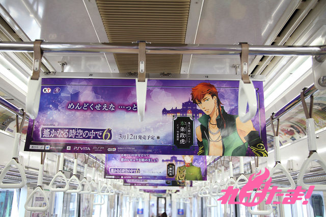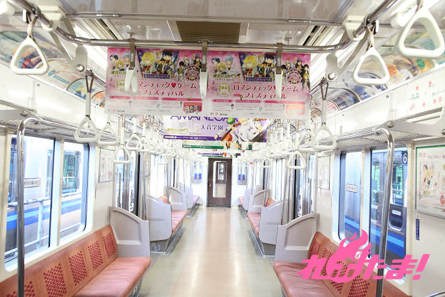 ▲車内の様子。ゲーム『遙かなる時空の中で6』、『金色のコルダ3 フルボイス Special』、『ときめきレストラン☆☆☆』それぞれのキャラクターたちが描かれたポスターで埋め尽くされている。
