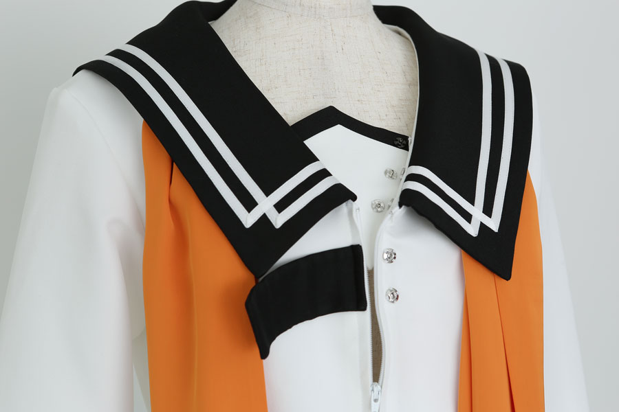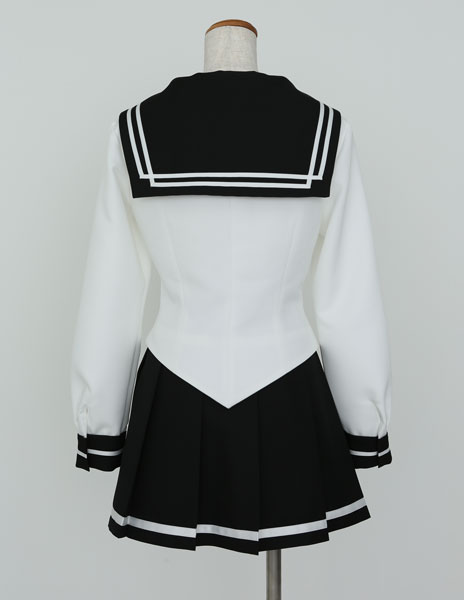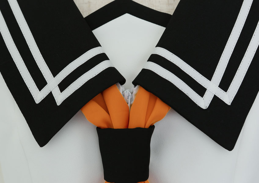 特徴的なセーラーカラーのラインや幅広のスカーフといった作中でも目を引くポイントに加えて、実用的な透け防止の裏地や脱ぎ着しやすい前中心のファスナー開きなど『聖ヶ坂学園女子制服』を機能面も細部までこだわり再現!