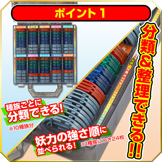 本商品は、妖怪メダル専用収納ケースです。クールな印象のクリアブラックの本体に妖怪メダルを最大240枚収納でき“くじガシャポン 妖怪おみくじ神社”での使用に特化した特別仕様となっています。