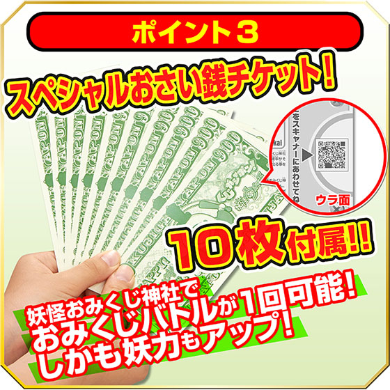 さらに、“妖怪おみくじ神社”でおみくじバトルが1回プレイできる「スペシャルおさい銭チケット」が10枚付属します。このチケットを使用すると、召喚した3体の味方妖怪にそれぞれ妖力が+300され、合計+900妖力がアップし、ゲーム中で大吉が出る確率が上がります(※)。