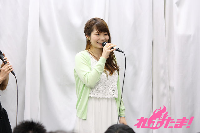 トークに続いてのライブパートでは彩音さんがトップバッターで登場。「とても思い入れの深い曲から聴いてもらいたいと思います」と挨拶すると、PS2ゲーム『ひぐらしのなく頃に祭』のオープニングテーマである「嘆きノ森」をしっとりと想いを込めて歌い上げた。さらに「みんなの笑顔が見えるようなこの曲を歌わせていただきます」と語ると、PSPゲーム『ひぐらしデイブレイク Portable』のオープニングテーマ「その先にある、誰かの笑顔の為に」を、客席からの手拍子にのせて明るく元気に披露。彩音さんが歌う歴代のテーマソングにファンは大喜び。