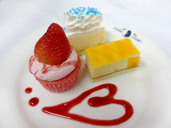 ピンクのいちごのカップケーキで島村卯月を、レアチーズケーキにホイップと青いお砂糖をのせて渋谷凛を、トロピカルフルーツムースにマンゴーソースで本田未央を表現しました。