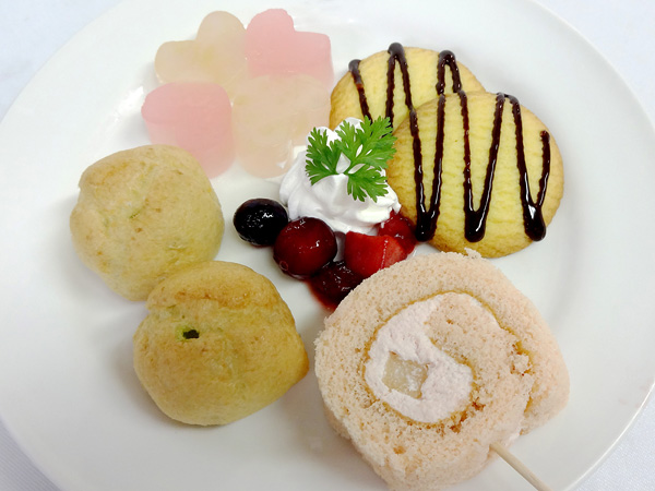 双葉杏、三村かな子、緒方智絵里のユニット「CANDY ISLAND」をイメージした スイーツセット。クローバーは白桃羊羹、シュークリームはチョコレートとプレーンを1つずつ、クッキーに加え杏の大好きなアメをイメージしたロールケーキも添えました。一皿でたくさんのスイーツを楽しめるスペシャルな一品!