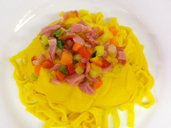 イメージした、可愛くってハピハピなパスタです! かぼちゃが練りこんであるタリアテッレにかぼちゃのホワイトソースをかけました。かぼちゃ、ベーコン、にんじん、ズッキーニなど、キラキラな飴玉のようにカラフルなお野菜がたっぷりです!