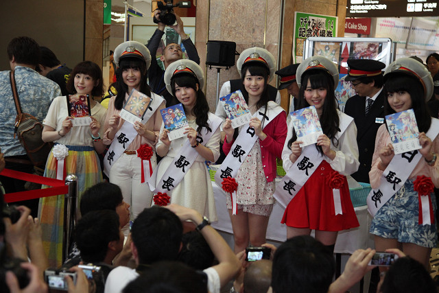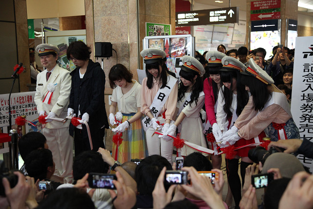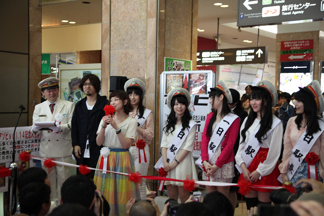 続いて駅構内で行われたテープカットには5人に加えて「マチ★アソビ」の発起人でもあるufotableの近藤光社長、徳島アニメ大使に任命された声優の中村繪里子が登壇し、挨拶を行った。立ち会った駅長もその働きぶりを褒め称えていた。この後はテープカットが盛大に行われ、イベントは幕を開けた。