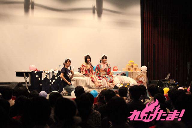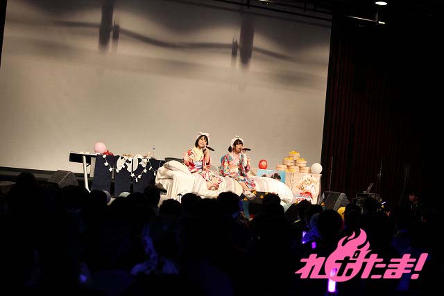「旅館でお布団 女子トーク」コーナーでは、ステージ上に用意された大きな布団の上に座ったふたりが「お風呂ではどこから洗う?」や「飼っているペットの話」、「バッグの中身について」など、女子っぽさ全開(?)の話題で盛り上がり、とりわけお風呂に関するトークでは、恥ずかしがりながらも大胆な告白をするふたりに、場内からは拍手喝采だった。
