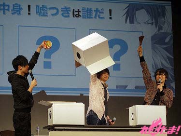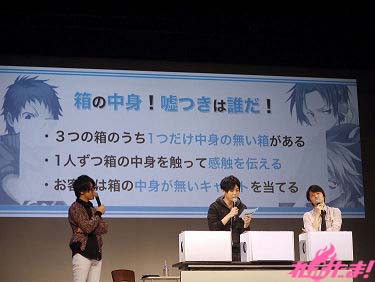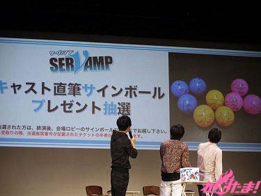 続いてのコーナーは「サーヴァンプサバイバル」。キャストと来場者でゲームをして遊ぼうというコーナー。3つの箱にキャスト陣が手を入れ、何も入っていない箱に手を入れたのは誰か来場者が当てる「箱の中身!嘘つきは誰だ!」と客席に紛れたクロのお面をキャスト陣が探す「クロを探せ!」の2回戦が行われ、結果は1対1の引き分け。賞品として来場者の中から抽選で選ばれた9人にサインボールがプレゼントされた。