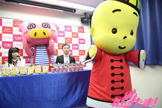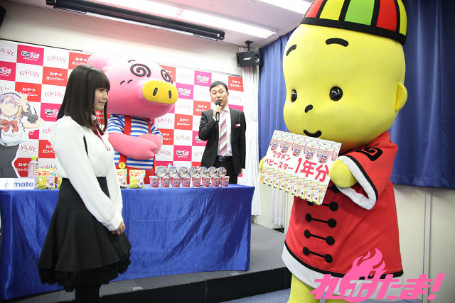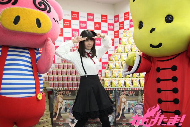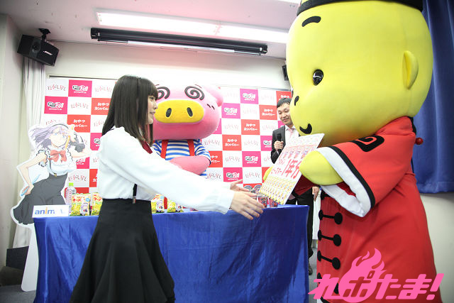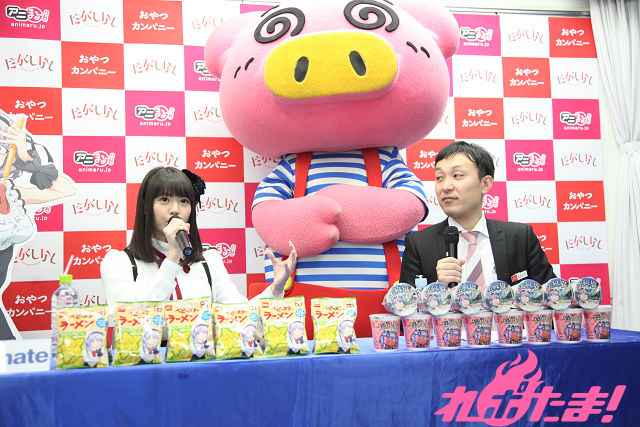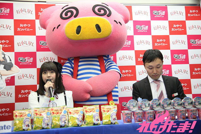 テレビアニメが現在放送中の『だがしかし』とおやつカンパニーの駄菓子『ブタメン』とのコラボ商品の発売記念記者会見が2016年2月22日(月)、東京・アニメイト秋葉原で開催された。当日はアニメでメインヒロイン・枝垂ほたるを演じた竹達彩奈さんが登壇。おやつカンパニー東京支店・山口さんと『ブタメン』パッケージキャラクターのブタメン君とともにトークを繰り広げた。