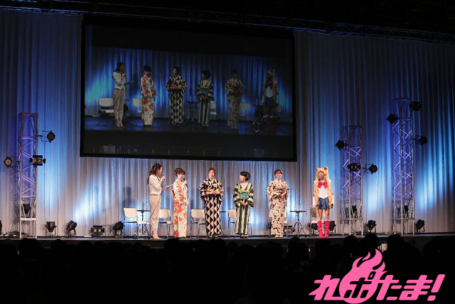 イベントが始まると、三石琴乃さん(月野うさぎ/セーラームーン役)、皆川純子さん(天王はるか/セーラーウラヌス役)、大原さやかさん(海王みちる/セーラーネプチューン役)、藤井ゆきよさん(土萠ほたる/セーラーサターン役)が着物姿で、今千秋監督がセーラームーンのコスプレをして登壇し、華やかさを演出した。