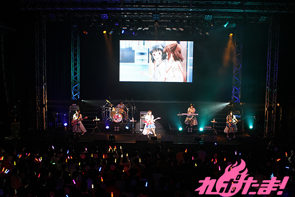 キービジュアルと同じスカイブルーの制服姿で登場した5人。バンドのテーマソング「Yes! BanG_Dream!」では愛美のまっすぐなボーカル、大橋の弾きまくるギター、ツボを抑えた西本のベース、大橋のパワフルなドラム、アクセントとなる伊藤のキーボードが一体となった演奏が、会場のボルテージを一気にアゲる。