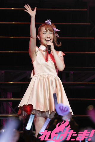 幕が開け、三段に組み上げられたステージのトップに立つうっちーはセカンドライブ同様、アップに纏めたヘアに薄ピンクドレスの出で立ち。早速繰り出すはキラキラときめくサウンドの「Floating Heart」。会場をダンスフロアに変えてみせる。珍しく振りを付けたという「color station」ではロボットダンスを踊って魅せる。