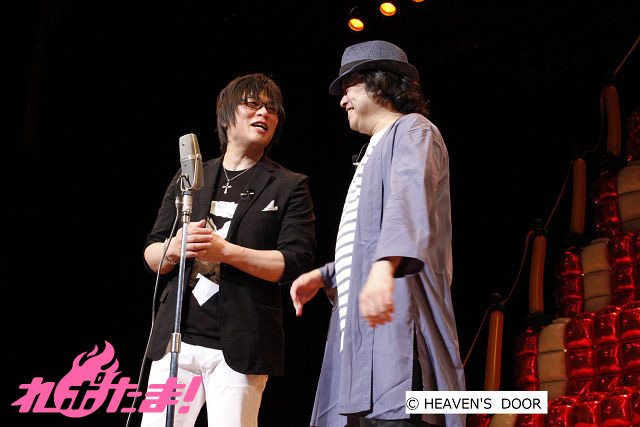 夜の部は森川さん&檜山さんのトークコーナーからスタート。『おまえら』21年目をむかえ今までの20年間を振り返り、しみじみと笑いを交え語るお二人。また地方公演をしたいという話では、地方はもれなく杉田智和さんがついてくるという話題に会場は大爆笑でした。そしてハガキのコーナーでは、森川さんが今回ゲスト出演している鈴木達央さんや谷山紀章さんたちと飲んださいのエピソードなどが披露されました。また昼の部で登場した森川さんと檜山さんを模したバルーン人形が再登場。セットに人形を座らせようとするも、なかなかうまく座らせられない檜山さんに笑いが巻き起こっていました。