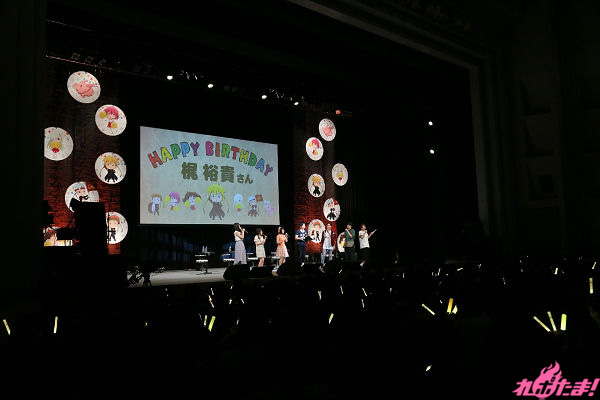 続いてハウザー役の木村良平さんからのコメントVTRが流され会場は大盛り上がり。ギルサンダー役の宮野さんと2人でアフレコ収録をしたそうで、宮野さんと2人きりの収録は珍しいので少し緊張したとアフレコ時のエピソードを披露。木村さんの梶さんのバースデーをお祝いするコメントからの流れで、会場みんなで「ハッピーバースデー」の歌を梶さんにプレゼント。そんな和やかな雰囲気の中、次のコーナーへ。