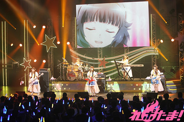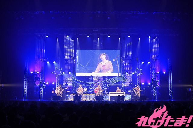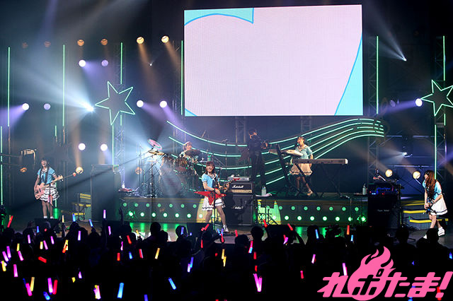 制服姿で登場した5人。朗読劇のち一曲目は「ぽっぴん’しゃっふる」。景気づけにはもってこいの一曲で会場を一気に沸かせ「夏空 SUN! SUN! SEVEN!」と続ける。この二曲で、すでに圧倒されてしまった。というのも、前回4月のライブとは、5人の演奏技術が段違いだったからである。特に顕著だったのがキーボードの伊藤。彼女のこのプロジェクトに対する気迫が伝わってくる。
