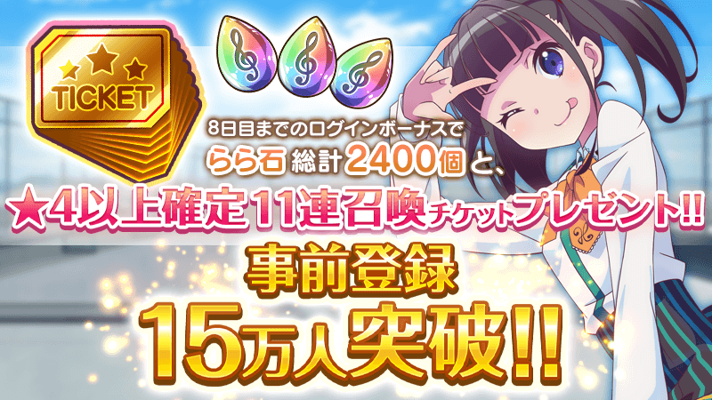 事前登録者数が15万人を達成し、特典として、らら石(ゲーム内通貨)、召喚(ガチャ)チケットなど、豪華初心者ログインボーナスを用意することが決まりました!