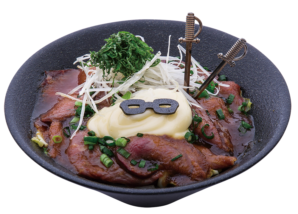 名セリフの『血と肉のあるものが好き』をイメージした剣が刺さったローストビーフ丼!!!