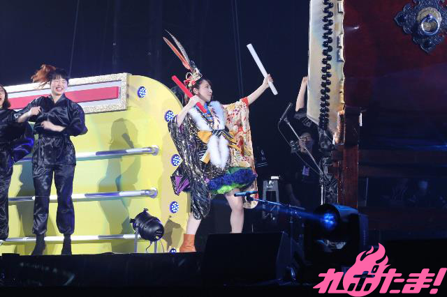 この後、ステージ上には巨大な和太鼓が登場。唐傘を持ったダンサーとともにきらびやかなドレスに着替えた内田さんが独特な空間を創り出す。「モラトリアムダンスフロア」、自ら太鼓のバチを持って叩きながら「からっぽカプセル」と披露していくと、「クロスファイア」では野球のバットを手にサインボールを客席に打ち込んでいくパフォーマンスも。