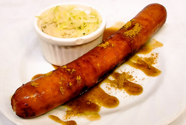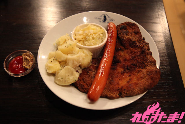 シュニッツェル(豚肉のカツレツ)とチーズ入りヴルストにあたたかくやわらかなジャガイモ、キャベツの酢漬けが添えられたボリュームたっぷりの一品。シュニッツェルは味付けされており、そのまま食べてもOK!
