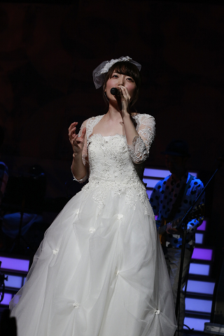 オープニングのSEが流れ、ステージ後方のスクリーンに教会の絵が写し出されると、アルバム「Opportunity」の1曲目、「スウィンギングガール」からスタート。イントロに合わせて階段上の扉がゆっくり開き、純白ドレスに身を包んだ花澤が登場すると、大歓声が湧きあがった。最新アルバム「Opportunity」のテーマが“UKサウンド”だったことからか、イギリスのロイヤルファミリーを彷彿とさせるドレスや教会といったモチーフが、作品の世界観を色濃く印象付ける。