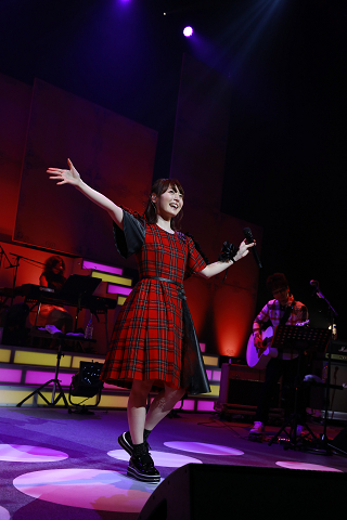 花澤がはけた後、軽快なギターリフからバンドメンバーによるジャムセッションが始まる。会場もリズムに合わせて手拍子したりこぶしを振り上げたりしながらで盛り上げると、バックバンド“ディスティネーションズ”のメンバー紹介。バンマスであり、デビュー以来花澤作品のサウンドプロデューサーを務める北川勝利(ROUND TABLE)の煽りに会場のボルテージが一層高まっていく。その熱気がピークに達した頃、赤いロンドンチェックのワンピースにお色直しをした花澤が登場。