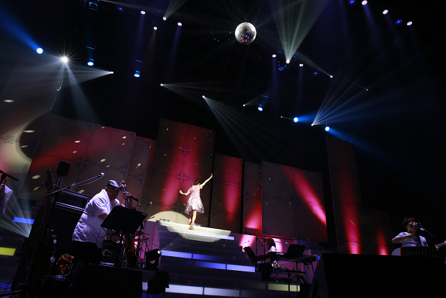 続く2曲目はシンプリー・レッドのミック・ハックネル作曲の「FRIENDS FOREVER」。イントロでは「皆さんこんばんはー!花澤香菜です!今日は楽しんでいってねー!」と観客を煽る。ホーンセクションが、“ブルー・アイド・ソウル”フィーリングのサウンドに彩りを添える。