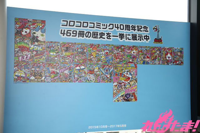▲店外にも、期間限定でこれまで刊行された『コロコロ』の全表紙を並べたカタログが張り出されたり、フォトスポットも用意されている。