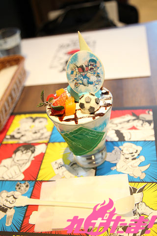 ▲記者が試食した『サッカーやろうぜ!!雷門イレブン超次元パフェ』(¥1,280)と『肉なし?つるセコ豆腐ハンバーグカレー』(¥1,480)。