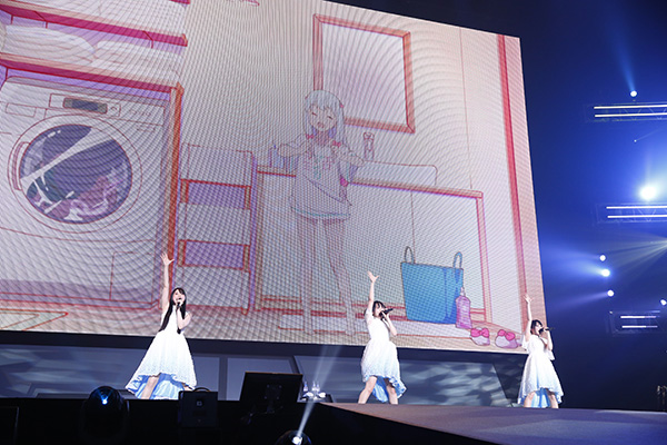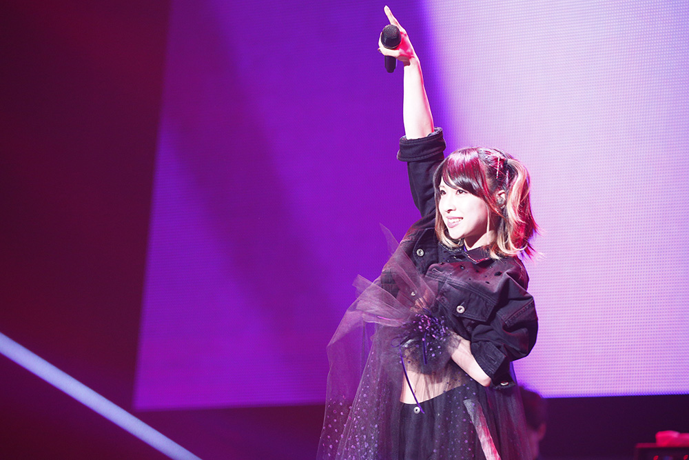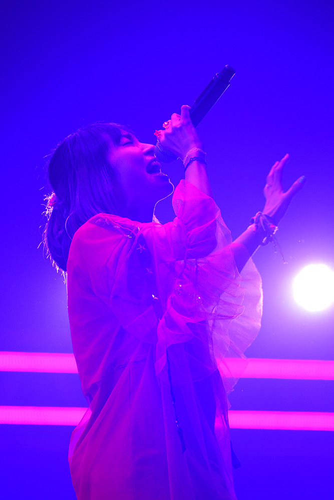 加えて、2番手としてステージに登場したアーティストに、観客はさらに驚かされる。なぜならそこに、雨宮 天の姿があったからだ。ソロとしての出演はアナウンスされていなかった彼女だが、デビュー曲「Skyreach」を凛々しくも鋭く歌いきっていく。そして終盤にはもちろんTrySaliとしても登場。最新シングル「adrenaline!!!」などの楽曲を通じ、ソロとユニットそれぞれでの魅力を届けてくれた。