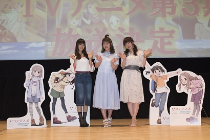 告知コーナーが終了すると、会場は暗転。舞台上のスクリーンには新作映像が映し出され「2017年OVA『ヤマノススメ おもいでプレゼント』&イベント上映決定」「2018年TVアニメ第3期放送決定」と発表された。会場からは割れんばかりの拍手とともに万歳三唱が巻き起こった。大久保勝飯能市長や、ここな役の小倉唯さんからのコメントムービーも上映され、会場はお祝いムード一色に。最後に井口さん、阿澄さん、日笠さんからコメントが述べられ、今後の展開への期待が膨らんだところで、イベントは幕を閉じた。