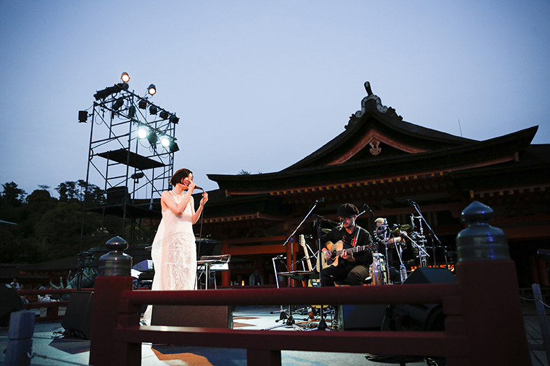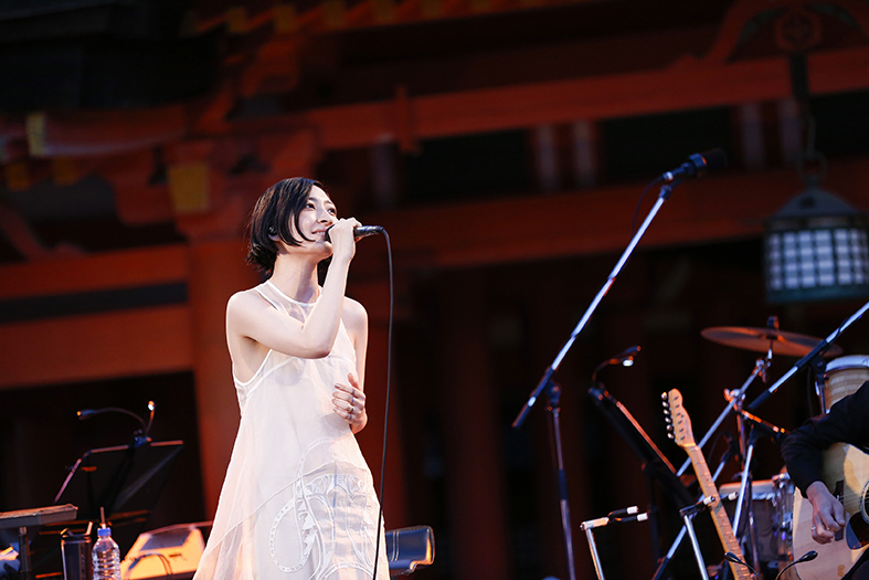 そして「鳥居が見えます、月も出てます、夕陽が沈んでいきます。そういう景色も全部、楽しみながらひとりひとりが自分の世界に浸るように聴いていただけたら嬉しいです」と、会場のあちこちに目を向けながら語ってくれた。涼やかな風が吹く中で歌われた「ループ」が更に夜を連れてきて、海をテーマに書かれた「ロマーシカ」の《きれい、って指差した空》というフレーズで彼女が指差した空をみんなで見つめたシーンも本当に美しかった。