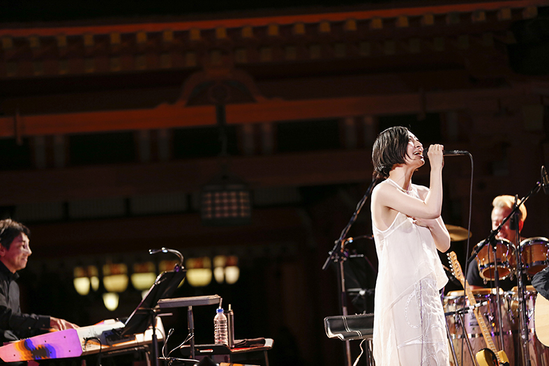 「ようこそ嚴島神社にお越しくださいました。良いお天気に恵まれて良かったですね」と、しみじみ嬉しそうに挨拶。「初めてここで歌わせていただいた2年前の話をしますと、前回は雨でした。その時のバンドのメンバーは3回屋外でライヴをして、3回雨に降られたんですけど。私が雨女の疑惑をかけられたので、今回はメンバーを変えて挑みました(笑)」と。前回のリベンジの意味もあり、今回は晴天に恵まれ、本人のみならずお客さんもきっとホッとしたことだろう。「でもあの時、雨が降ってくれたから今回またこうして機会をいただけて。人生に二度も、しかも今回は2日間もこの場所で歌えて幸せです」と感謝。