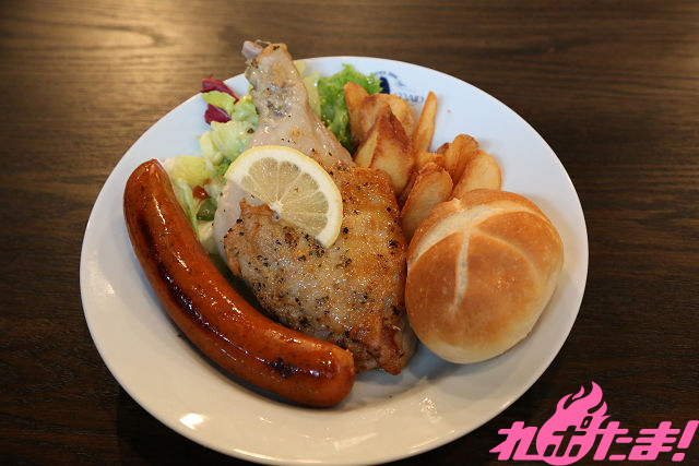 ローストチキン、フライドポテト、そしてゴーダチーズとパプリカが入ったピザ風味のグリルソーセージがスパイシー! さらにサラダにプチパンと、1皿でおなかも大満足!