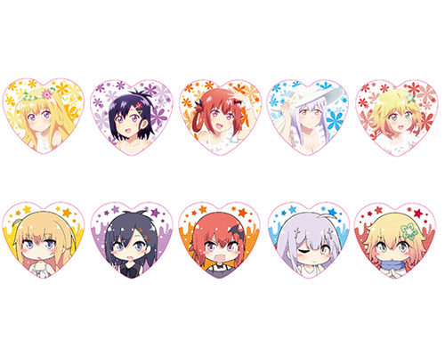アニメ描き下ろしのイベントビジュアルと、原作・うかみ先生の描き下ろしイラストを使ったハート型の缶バッジ全10種。さらにシークレット1種も用意しました!どれが当たるかは開けてからのお楽しみ♪