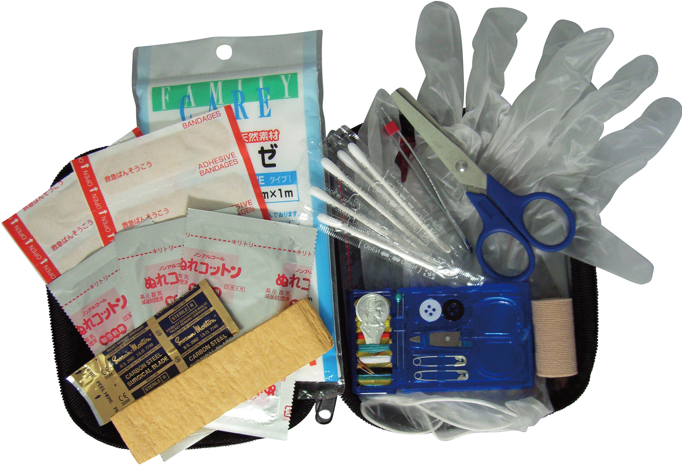 ■エイドキット:綿棒、裁縫セット、ハサミ、ピンセット、絆創膏などが入った救急セットです。