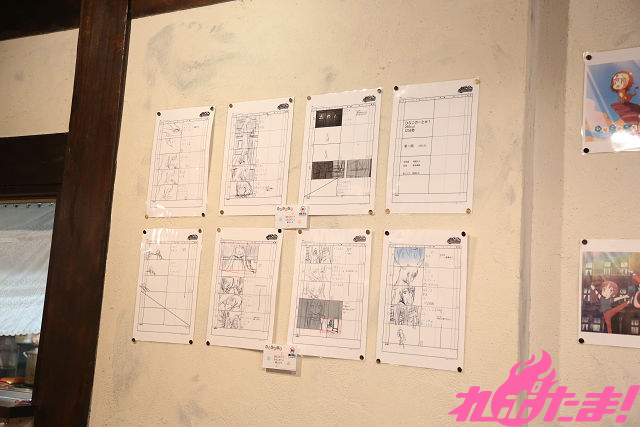 ▲店内の様子。三月先生が来店した際に書かれたサインやキャストのサイン、絵コンテなどが張られている。「早口言葉の挑戦」も!