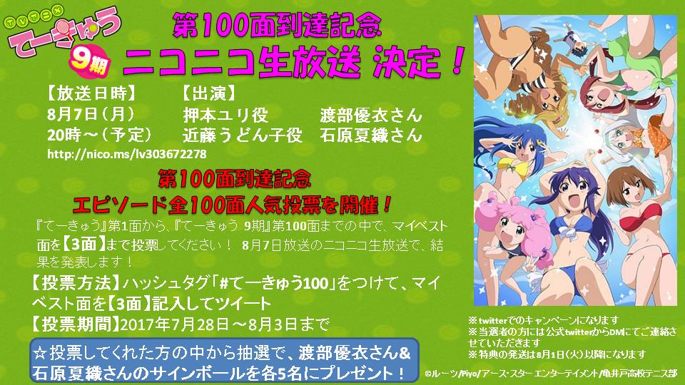 『てーきゅう』第1面から、『てーきゅう 9期』第100面までの中で、マイベスト面を【3面】まで投票を受け付けています。ハッシュタグ「#てーきゅう100」をつけてツイートしてください。投票は何度でも可能です。投票期間は8月3日まで。