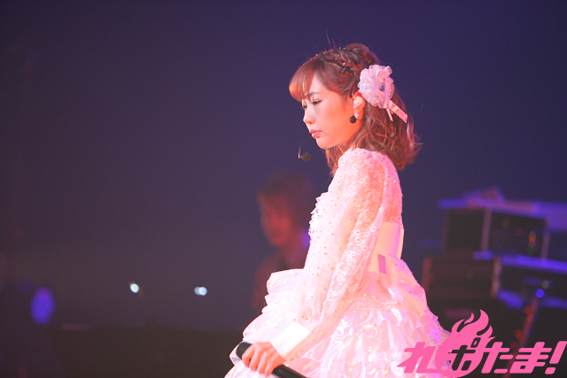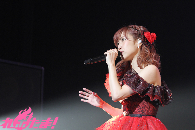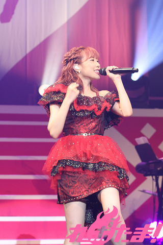 白のドレスから、赤い肩出しの魅惑的なドレスに衣装チェンジし、ライブは後半戦。「夏ハジメマシタ☆」でファンとコールアンドレスポンスを楽しみ、「タイムリミットサマー!」では得意のダンスで魅せる。マイクスタンドに手を這わせ指を絡ませ、足を蹴り上げるセクシーなダンスにはドキリとさせられたファンも少なくないことだろう。