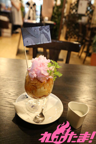キャラメルソースとカスタードプリンでナナチを、ピンクと銀のアラザンを散らした綿菓子でミーティをイメージしたふわふわ甘いパフェ。