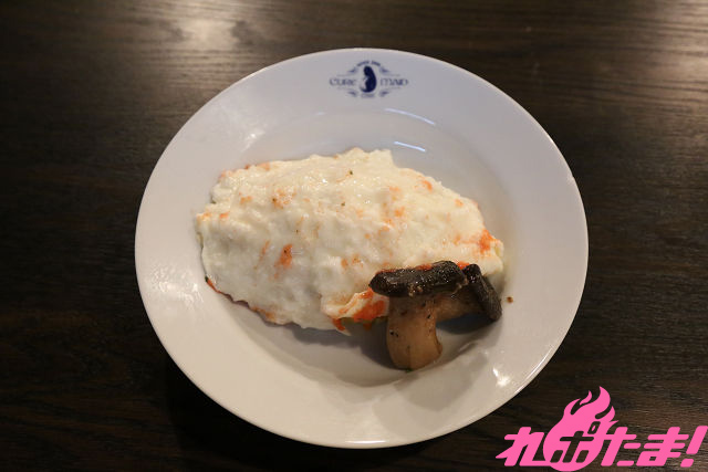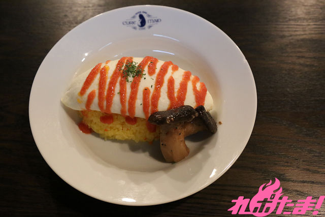 リコをイメージした黄色いバターライスに、ふわふわのミーティをイメージした白オムレツにタラコソース。中はとろっとろの卵入り! リコの傷を治したきのこも添えて。